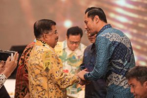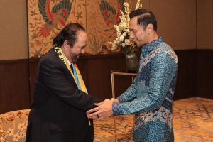 AHY menyertakan fotonya yang sedang bersalaman dengan Presiden Jokowi yang hadir pada acara tersebut. “Ketika bertemu Presiden Jokowi, saya menyampaikan semoga beliau sehat dan sukses selalu,” tulis AHY.