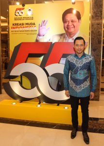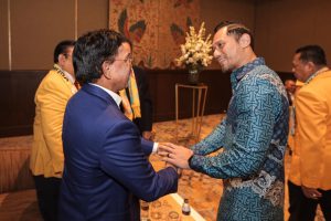 Jakarta: Wakil Ketua Umum Partai Demokrat Agus Harimurti Yudhoyono (AHY) menghadiri HUT ke-55 Partai Golkar di Golden Ballroom, Hotel Sultan, Jakarta Selatan, Rabu (6/11) malam. Acara itu mengambil tema “Kreasi Muda Indonesia”. AHY tiba sekitar pukul 19.00, mengenakan batik berwarna biru muda.