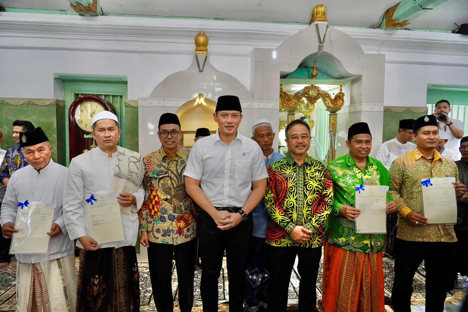 “Alhamdulillah untuk masjid yang telah berdiri sejak tahun 1.500-an ini, hari ini ada sertipikatnya, sehingga jelas statusnya, legalitasnya formal resmi dari negara, dari pemerintah,” kata Menteri AHY dalam sambutannya usai menyerahkan sertipikat.