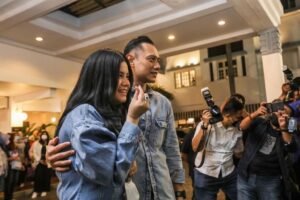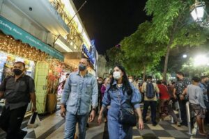Surabaya, Jawa Timur: Malam mingguan di Surabaya, Agus Harimurti Yudhoyono (AHY) dan istri Annisa Pohan, jalan-jalan menyusuri Tunjungan Romansa salah satu ikon Kota Surabaya, Sabtu (19/2) malam. AHY juga ditemani Eri Cahyadi teman kuliah S3 di Unair yang menjadi Wali Kota Surabaya. Tetap mematuhi protokol kesehatan, AHY dan Annisa menikmati indahnya suasana malam Tunjungan Romansa sambil sesekali menyapa warga yang juga sedang bermalam mingguan dan melayani masyarakat yang minta foto bersama.