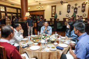 Sebelum mlaku-mlaku di Tunjungan Romansa, AHY dan Annisa diajak makan malam oleh Eri Cahyadi Wali Kota Surabaya yang kebetulan adalah teman sekelas AHY di program Doktor PSDM di Universitas Airlangga (Unair). AHY diajak menikmati kuliner khas Jawa Timur seperti Rawon Iga, Soto Lamongan, Sop Kikil, dan Kulup Urapan. Hadir juga Wakil Direktur Pasca Sarjana Unair Suparto dan teman-teman kuliah lain yang menambah hangat suasana malam mingguan. (adt/csa)