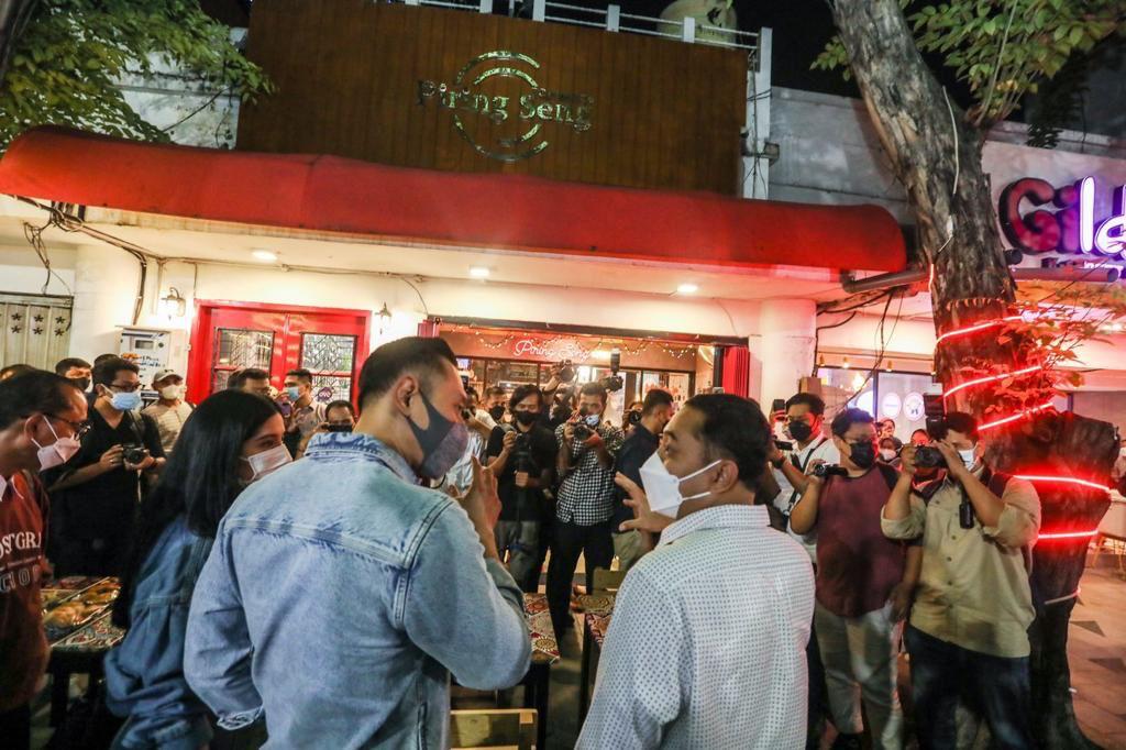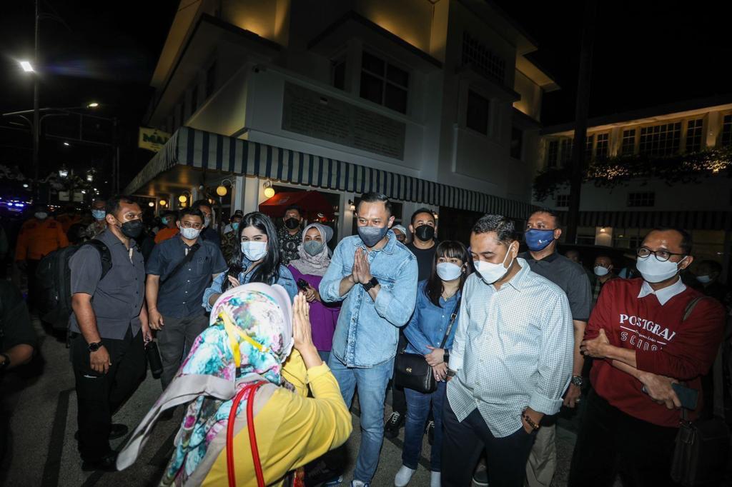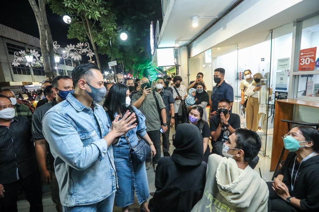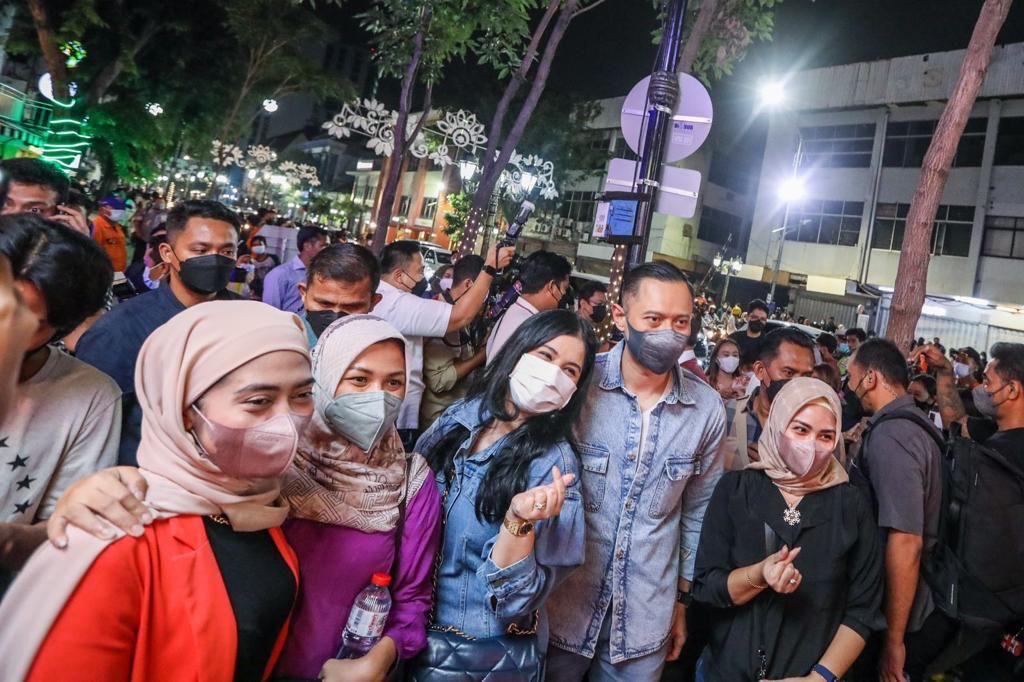 Surabaya, Jawa Timur: Malam mingguan di Surabaya, Agus Harimurti Yudhoyono (AHY) dan istri Annisa Pohan, jalan-jalan menyusuri Tunjungan Romansa salah satu ikon Kota Surabaya, Sabtu (19/2) malam. AHY juga ditemani Eri Cahyadi teman kuliah S3 di Unair yang menjadi Wali Kota Surabaya. Tetap mematuhi protokol kesehatan, AHY dan Annisa menikmati indahnya suasana malam Tunjungan Romansa sambil sesekali menyapa warga yang juga sedang bermalam mingguan dan melayani masyarakat yang minta foto bersama.
