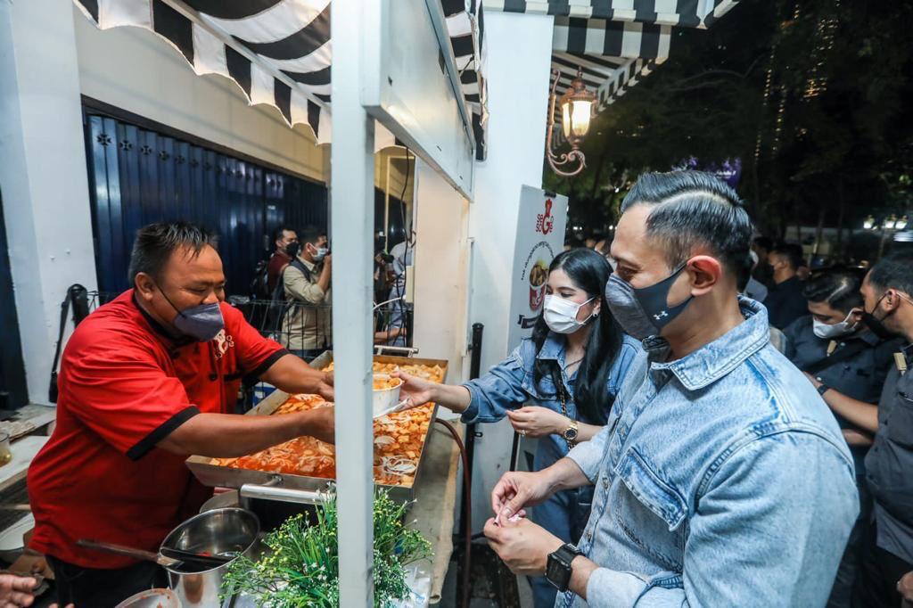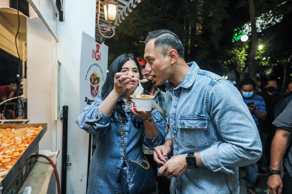 Di sepanjang jalan Tunjungan terdapat pertunjukan kesenian dan juga pedagang UMKM kuliner. AHY dan Annisa beberapa kali mampir untuk membeli dan mencicipi berbagai makanan yang dijual. “Saya pesan dua Bu, kembaliannya disimpan saja,” ujar AHY saat membayar makanan yang dipesannya.