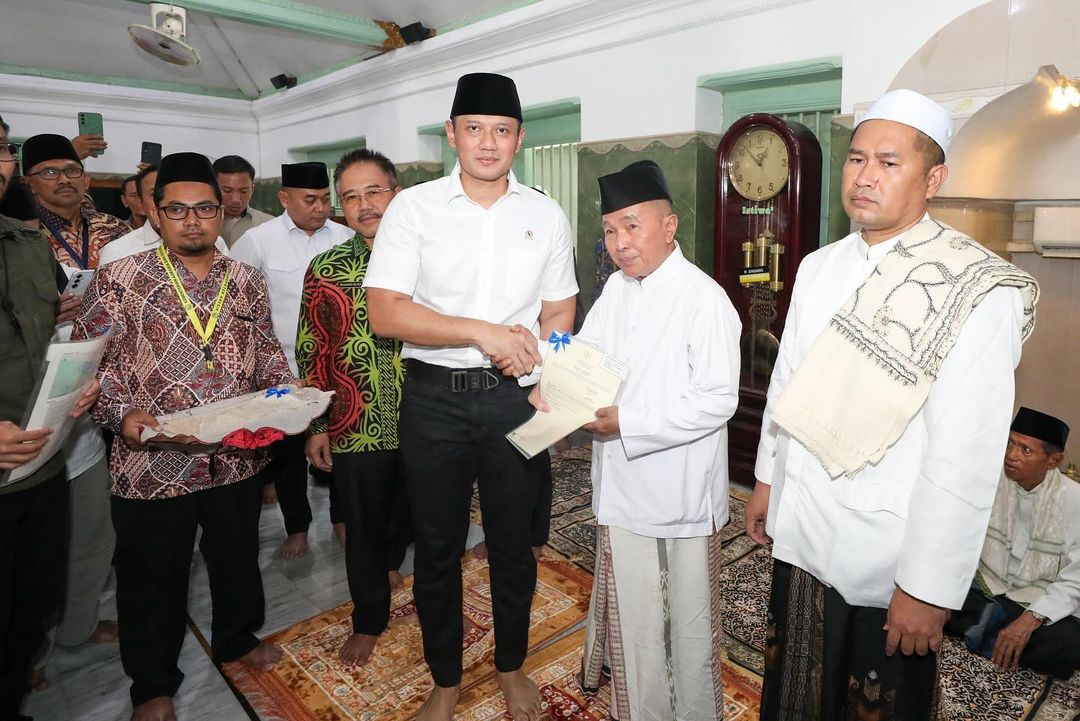 Gresik – Menteri Agraria dan Tata Ruang/Kepala Badan Pertanahan Nasional (ATR/BPN), Agus Harimurti Yudhoyono (AHY) menyerahkan sejumlah sertipikat tanah kepada masyarakat Kabupaten Gresik, Jumat-Sabtu (05-06/07/2024). Di hari pertama kunjungannya, Menteri AHY menyerahkan sertipikat tanah wakaf di Kompleks Pemakaman Sunan Giri.