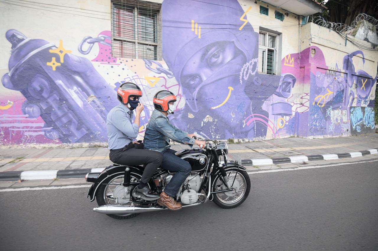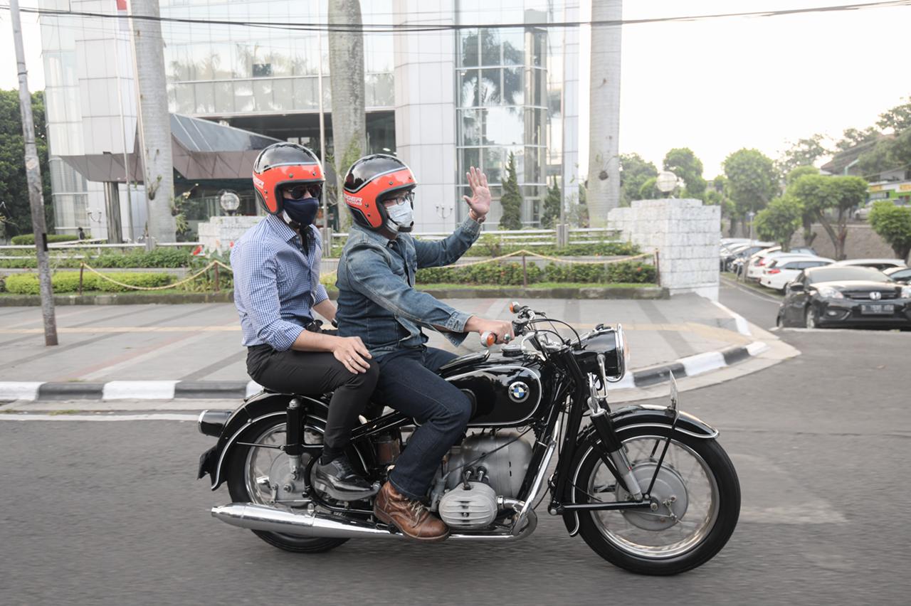 Bandung, Jawa Barat: Ketua Umum Partai Demokrat Agus Harimurti Yudhoyono (AHY) dibonceng oleh Gubernur Jawa Barat Ridwan Kamil menggunakan sepeda motor klasiknya dari Rumah Dinas Gedung Negara Pakuan ke Caffe Nara Park, Jumat (4/6) sore.