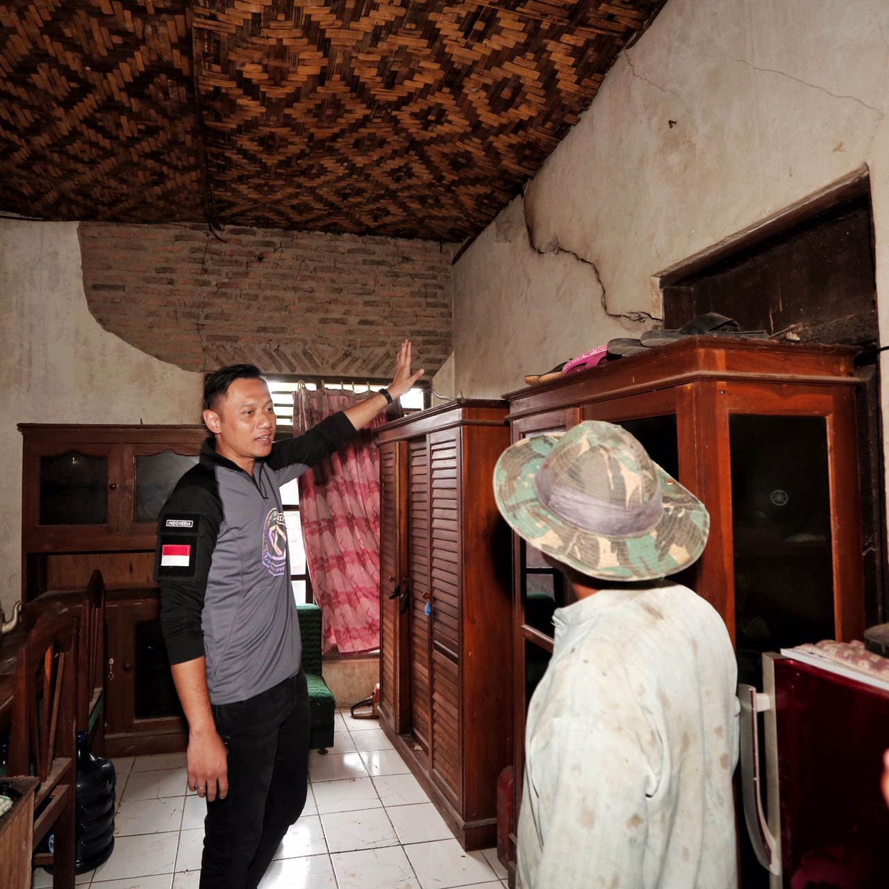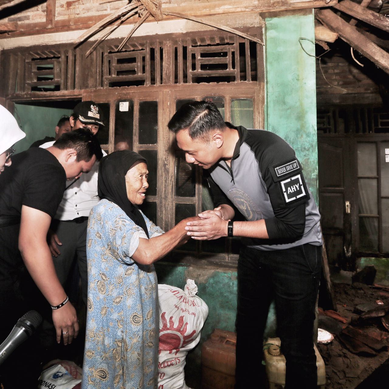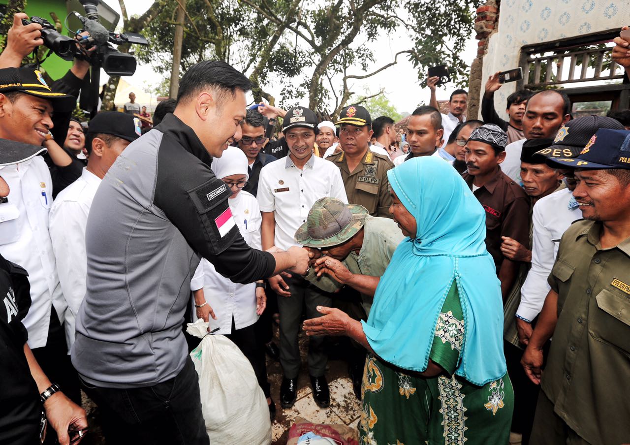 Warga sekitar keluar dari rumah mereka masing-masing dan menyambut kedatangan AHY. Sambil memenuhi permintaan warga untuk bersalaman dan berfoto, AHY mendatangi rumah salah satu warga yang rusak parah akibat goncangan gempa. Terlihat bagian samping rumah Pak Cumang dan Bu Eti hanya tersisa rangka dan tumpukan tembok yang roboh. Sambil menghibur dan menyemangati, AHY menyerahkan bantuan kepada mereka.