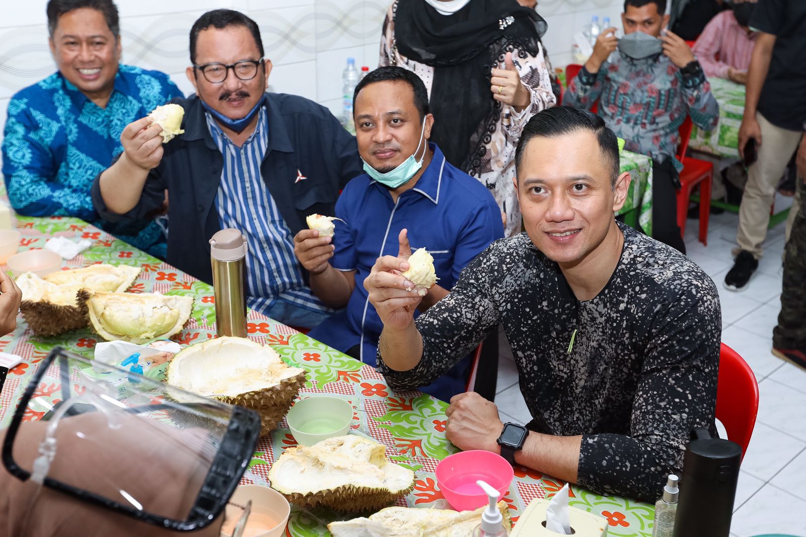 Setelah selesai menikmati kuliner Sulawesi Selatan, AHY langsung diboyong untuk menikmati durian. Di setiap kunjungan ke daerah, AHY selalu menyempatkan diri untuk mencari dan menikmati durian khas daerah tersebut. “Wah ini saya pernah ke sini, mantap-mantap sekali memang duriannya. Makasih banyak lho Pak Gub,” ungkap AHY senang.