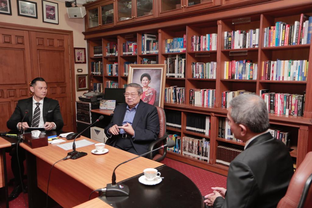 Cikeas, Jawa Barat: Presiden ke-6 RI Susilo Bambang Yudhoyono (SBY) menerima kunjungan Menteri Luar Negeri Singapura Vivian Balakrishnan di kediaman Cikeas, Bogor, Jawa Barat, Rabu (17/7) siang. Saat menerima Vivian, SBY juga didampingi Agus Harimurti Yudhoyono Direktur Eksekutif The Yudhoyono. Sebelum berkunjung ke Cikeas, Vivian baru saja bertemu dengan Presiden Joko Widodo di Istana Bogor.
