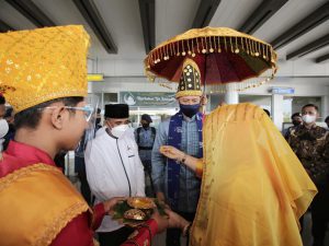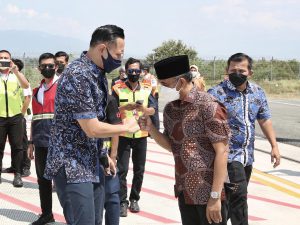 Palu, Sulawesi Tengah: Setelah menempuh perjalanan udara lebih kurang satu jam dari Kota Banjarmasin, Ketua Umum Partai Demokrat Agus Harimurti Yudhoyono (AHY) bersama rombongan tiba di Kota Palu, Sulawesi Tengah, Senin (26/4) siang. Di Bandar Udara Mutiara SIS Al-Jufrie, Ketum AHY disambut dengan tarian Peulu Cinde dan langsung disematkan Buyasabeh subi berupa sarung sutra Donggala bermotifkan benang emas juga Songkok Siga. Songkok Siga biasa dipakaian kepada tamu sebagai tanda penghormatan atau tanda kebesaran yang sudah dilakukan sejak Kerajaan Lembah Palu oleh Suku Kaili.